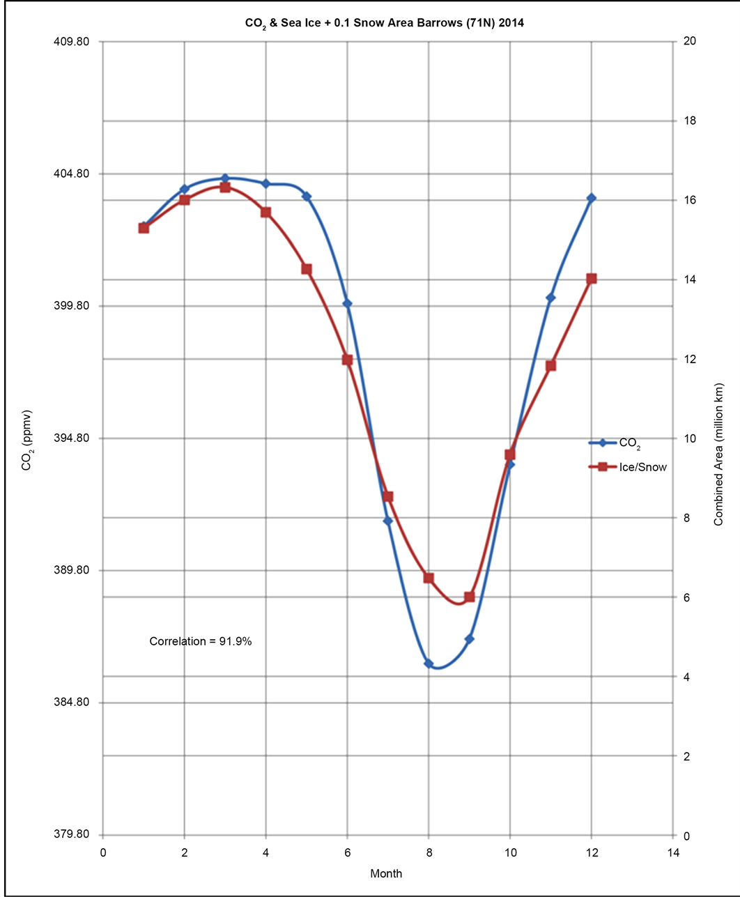 Figure 29. Plot of CO2 & sea ice + snow for Barrows, Alaska in 2014. Ice & snow data from NSIDC.