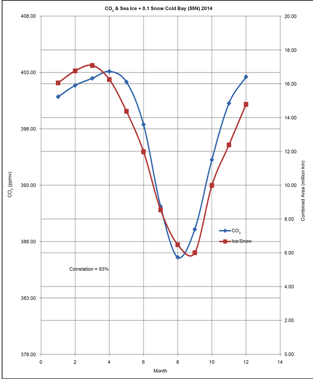 The final analysis is whether there is a good correlation between seasonal sea ice/snow and CO2 concentration. The sea ice and snow areas used in this analysis are based on 2011 data. However, as can be seen in Figure 26 and Figure 27 the sea ice and snow changes are relatively small and would have minimal effects in this analysis. The ice and snow data are from the National Snow & Ice Data (NSIDC) 2008 University of Colorado, Boulder, Colorado USA doi http://dx.doi.org/10.7265/N52R3PMC, data set G02156. References to NSIDC are to this data source. The sea ice area cannot be added to the snow area because there is a considerable difference in equivalent water content. The snow cover is therefore reduced by using the water content value, i.e. 10% of the snow represents liquid water.