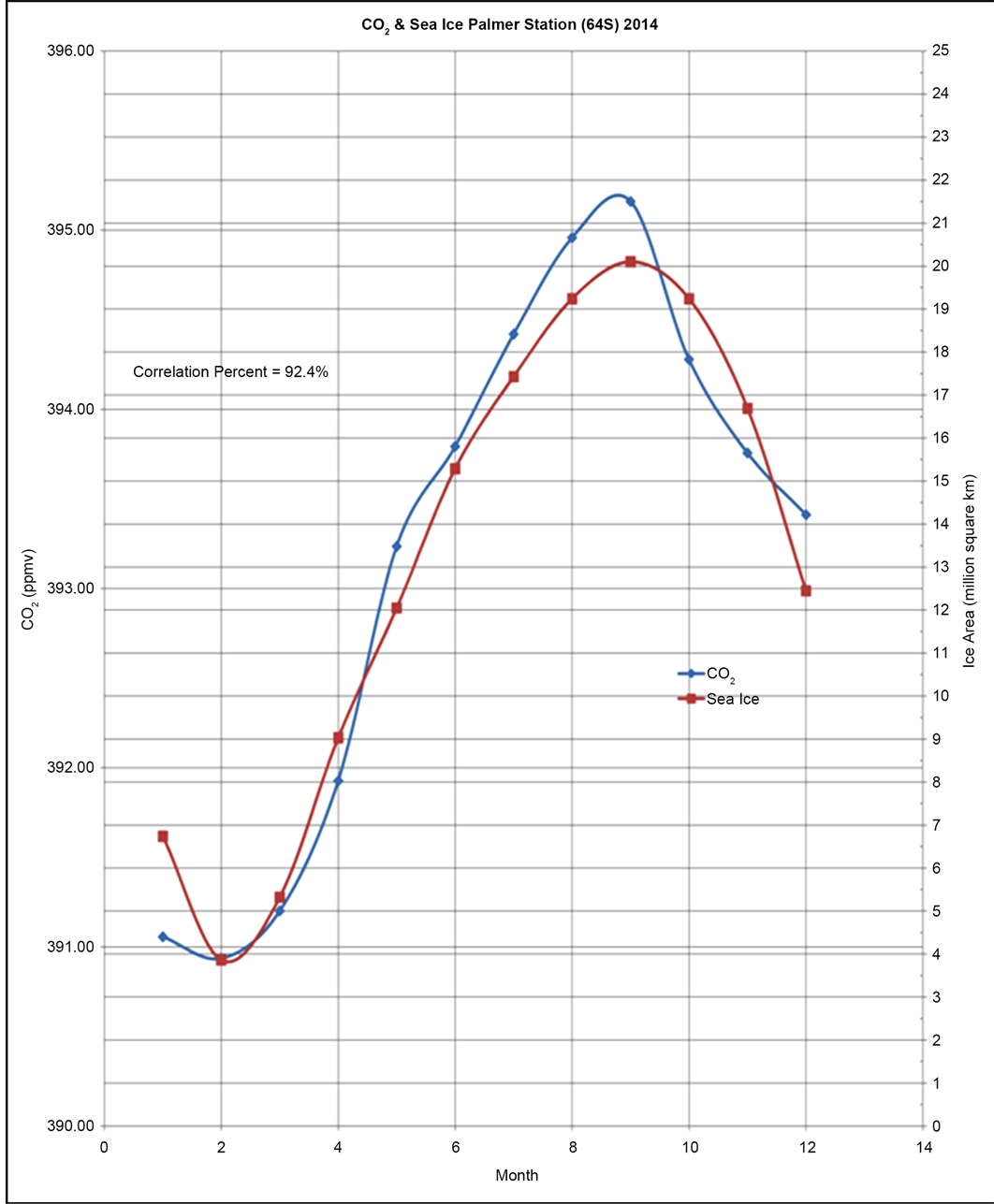 Figure 31. Plot of CO2 & sea ice for palmer station, Antarctica in 2014. Ice & snow data from NSIDC.