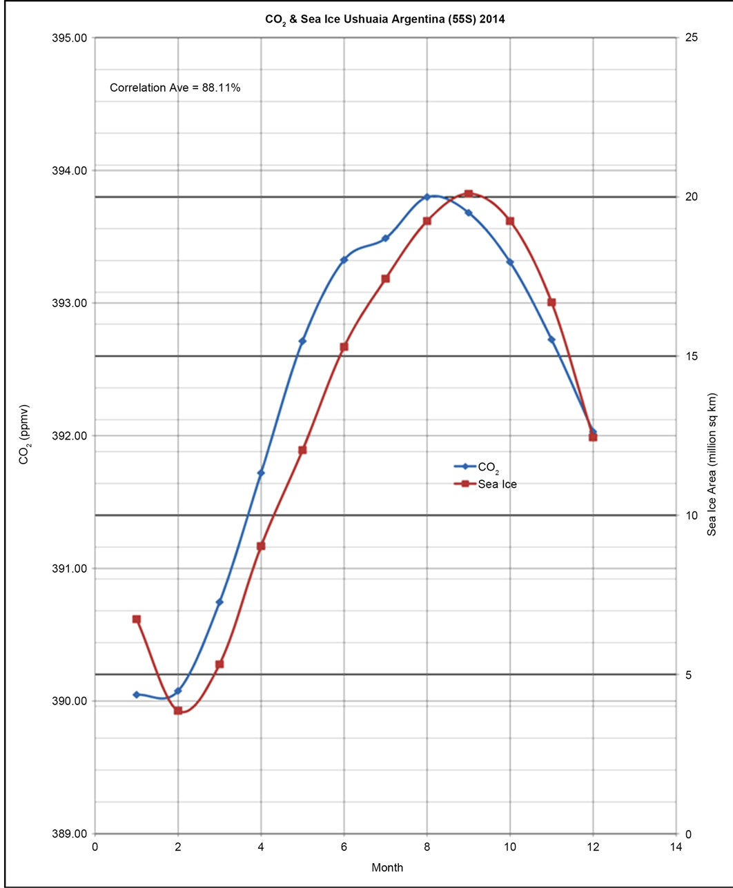 Figure 32. Plot of CO2 & sea ice for Ushuaia, Argentina in 2014. Ice data from NSIDC.