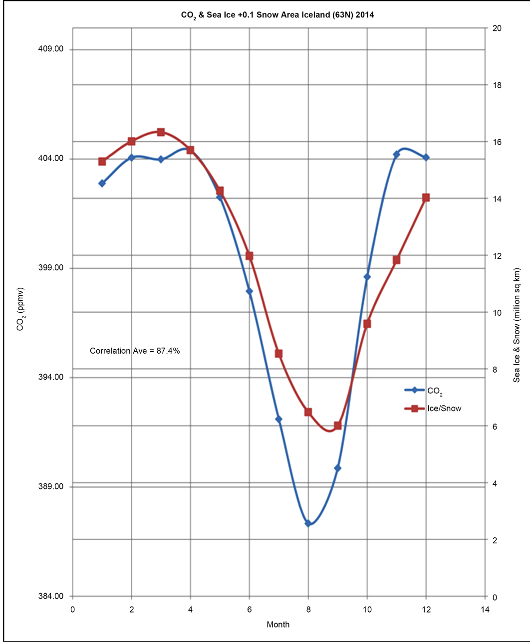 Figure 33. Plot of CO2 & sea ice for Iceland in 2014. Ice & snow data from NSIDC.