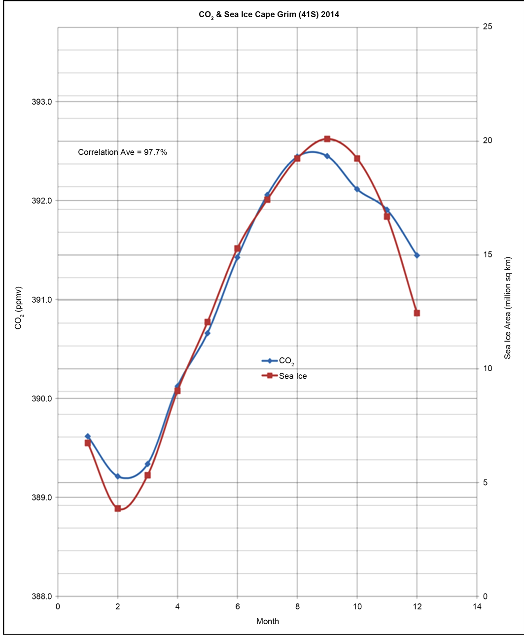 Figure 34. Plot of CO2 & sea ice for cape grim, Australia in 2014. Ice data from NSIDC.