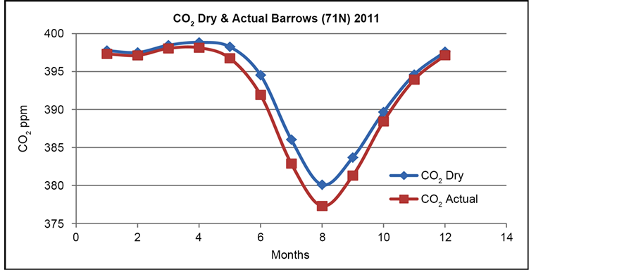 In the Polar Regions the dry CO2 and the actual CO2 concentrations are nearly the same. This is illustrated by Figure 2 plotting the two measurements from Barrows Alaska (71˚N). All dry CO2 data was obtained from the Earth Systems Research Laboratory of the National Oceanic & Atmospheric Administration (NOAA). All references to ESRL are from this data source. The selected year is representative since graphs for different years show the same type of relationship.