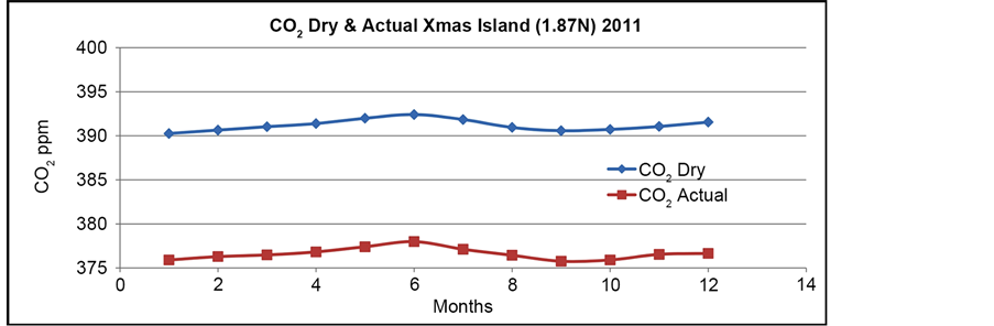 Figure 3 is the same type of graph except using data from Christmas Island (1.87˚N), which is representative of the equator. Comparing Figure 2 and Figure 3 shows an increasing deviation associated with a drop in latitude. The deviations between dry and actual in the Southern Hemisphere are similar.
