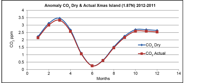 Figure 4 is a plot of the dry CO2 anomaly in 2012 compared to 2011 with the actual CO2 anomaly for the same period at Christmas Island, Kiribati. Comparing Figure 3