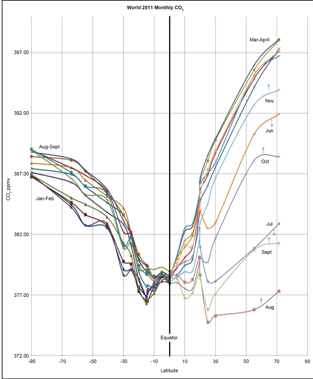 The 2011 monthly variations in the Northern Hemisphere (NH) were more erratic than those in the Southern Hemisphere (SH). At −90˚S the spread was about 2.5 ppmv with fluctuations grouped into three 4-month segments. That is, the high concentrations lasted about 4 months, the lows for 4 months, and the transitions at 4 months. The NH had a spread at Barrows almost 8 times greater at 20 ppmv. The highs lasted 6 months, the low lasted 1 month, and the transitions spanned 5 months.