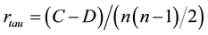 Let C and D denote the number concordant and discordant pairs, respectively. The Kendall Tau coefficient is defined as:
