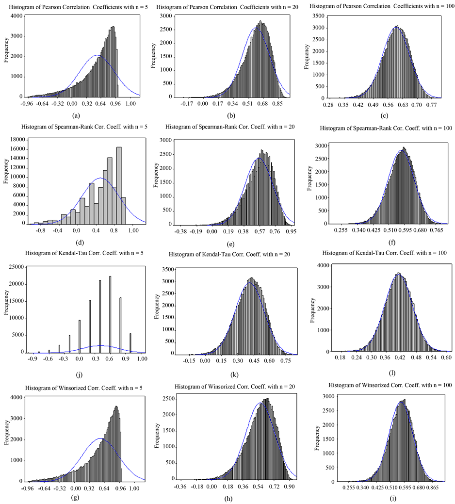 Figures 1-3 (also these) are examples of the sampling distributions of the five correlation coefficient methods for the true correlation coefficient of 0.6 and sample sizes of 5, 20 and 100, respectively. Each sampling distribution