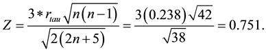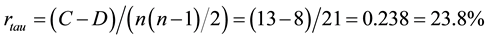 For this data set, the number concordant and discordant pairs are found to be 13 and 8, respectively. Thus, the Kendall Tau correlation coefficient and its significance test are calculated as follows: