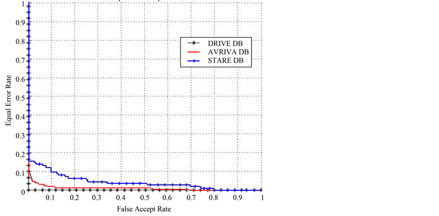 The proposed method is implemented and executed on MATLAB stand and has been examined on above-men- tioned retinal datasets. We used the following performance measures in our analysis to determine the accuracy of proposed method, Equal Error Rate (EER), False Acceptance Rate (FAR), Genuine Acceptance Rate (GAR), and False Rejection Rate (FRR). FAR means the accepting imposter rate, it is a measure of the number of cheaters users accept falsely in the system as “genuine” users. FRR represents the rate of rejecting genuine user, it is a measure of the number of falsely rejected many genuine users by the system as “imposters”. GAR represents the rate of accepting genuine user, it is the ratio of the extracted features of every user to other image patterns of the same user. After complete the comparisons, if the value of similarity rate is greater than the value of fixed threshold, then the user is accepted as a genuine. While if the user is rejected, it means that a real user is not acceptable. i.e. it implies that falsely rejected. This locates false rejection rate FRR. We can find the measurement of these inaccuracy ratio by mapping a chain of impostor scores and genuine scores into chart based on their score and frequency. In order to get False Acceptance Rate (FAR), We compare vector features of every user to other vector features of all users in the data base.