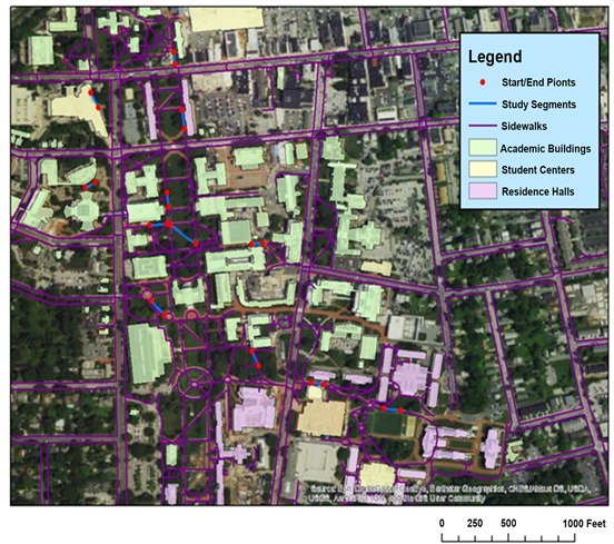 A total of twelve locations were chosen around campus. This number is a large enough sample to include different geometric features and user characteristics. For each path, a segment was chosen to collect the data. The segment chosen had uniform width and did not contain a major intersection with another path. However, there are building entrances, side door entrances, benches, and bike racks within the segments chosen. The segment lengths range from 45 feet to 176 feet long. The twelve locations for the data collection are shown on the map below (Figure 1) and the locations are listed in Table 1.