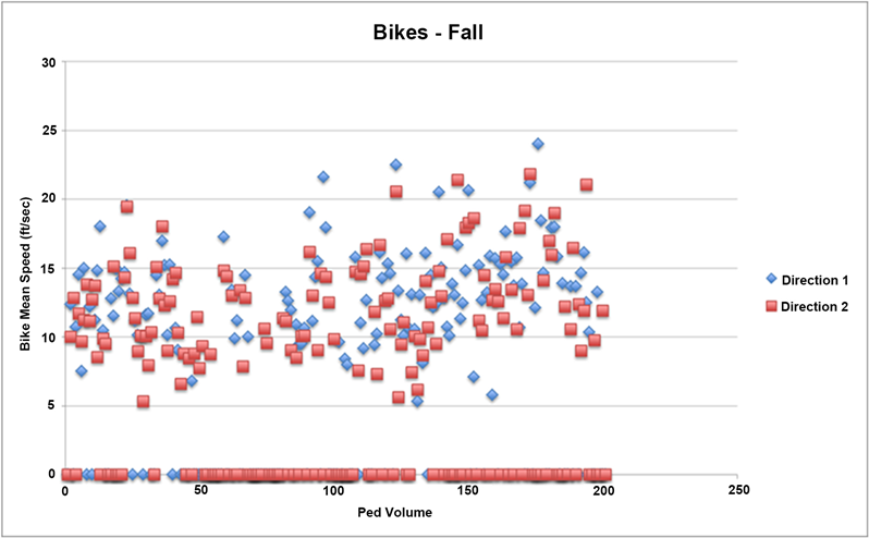 Figure 2. Ped volume vs bike mean speed―Fall.