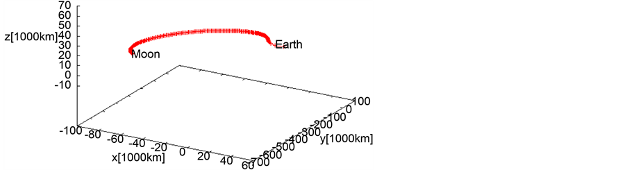 Applying the scheme presented in section 2, we wrote simple C++ program. In every step the algorithm chooses one point on the trajectory, change it and accept the mutation if it leads to the smaller value of the distance d (3). In our simulations we constrained the numbers of points between initial and final time to 200, restricted the maximal mutation value in one step to less than 10−4 Earth-Moon distance, and as a starting and final position of the spacecraft choose respectively the point at 6500 km from Earth center and 2000 km from Moon center. After