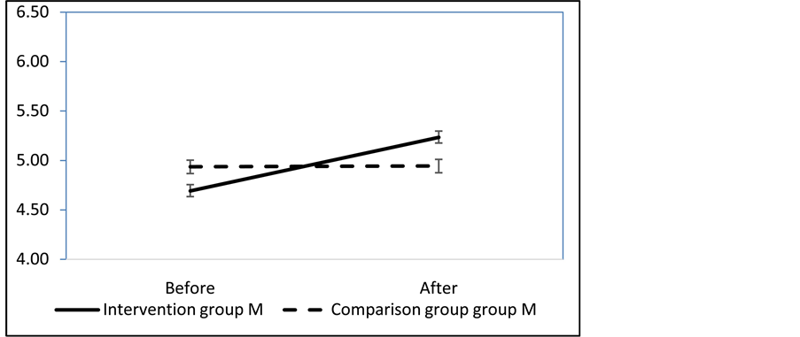 in the beginning. Further, the task value increased in the intervention group, but remained the same in the comparison group. The gain scores of the task value between the intervention group and the comparison group differed significantly (p < 0.001, ηp2 = 0.136), showing different development of the groups between the two measurements. The difference was significant at both the first measurement point (p < 0.001, ηp2 = 0.135) and the second measurement point (p < 0.001, ηp2 = 0.419). In the intervention group, the difference of the mean values during LQ was significant (p < 0.001, ηp2 = 0.266), while among the comparison group, no statistical difference in the mean scores was found between the two measurement points (p = 0.86, ηp2 = 0.000).