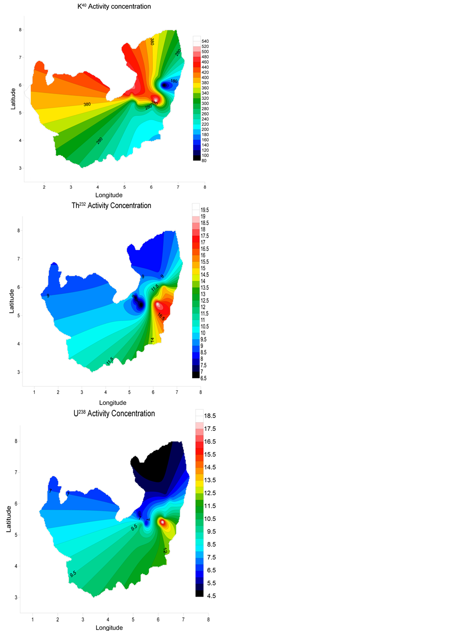 Radioactivity mapping of the study area was carried out using the Surfer programming software. Surfer is a contouring and 3D surface mapping program that runs under Microsoft Windows. The program was used to converts data generated for activity concentration at different coordinates of location within the state into maps. Figure 2 shows the radioactivity mapping of study sites within Delta state for K40, Th232 and U238 in sampled sediments.