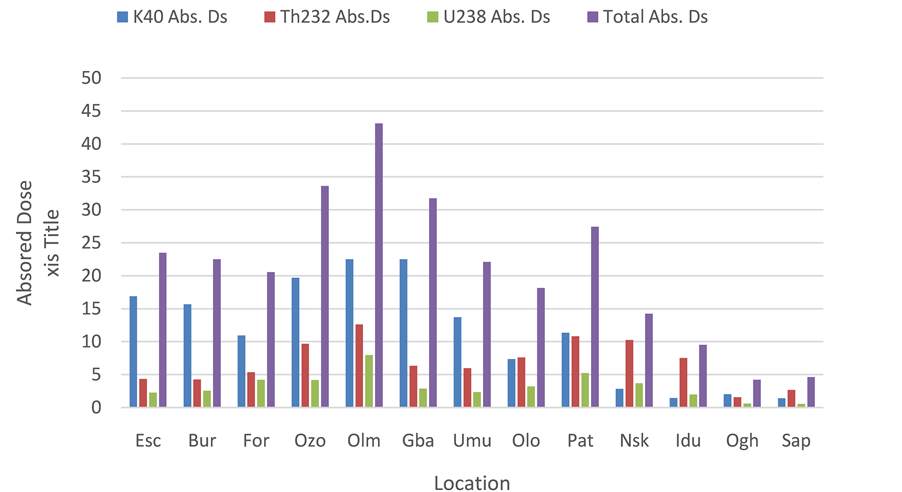 where CK, CTh and CU are activity concentration of K40, Th223 and U238 respectively. Table 3 shows range of activity concentrations, mean concentration, Absorbed Dose and Annual Effective dose equivalent of K40, Th232 and U238 in the sediment samples. Figure 3 shows the variation in the total absorbed dose in sediment samples across sample locations in Delta state.
