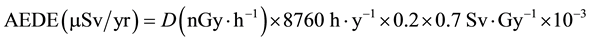 In estimating the annual effective dose equivalents, the conversion coefficient from the absorbed dose inairand the outdoor occupancy factor were considered. A value of 0.7 Sv/Gy was used for the conversion coefficient from the absorbed dose in air to an effective dose received by adults and 0.2 for the outdoor occupancy factor (UNSCEAR 2000). The annual effective dose equivalent was calculated from equation