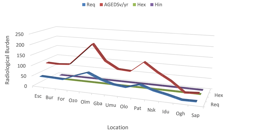 where CRa = CU, CTh and CK are the activity concentrations of 238U, 226Ra, 232Th and 40K, respectively, in Bq/kg. Table 4 show that the values of Hex ranged from 0.023 to 0.23 in all study locations which is less than 1. Hence, the radiation hazard at study areas are negligible. Figure 4 shows the variation of some radiological indices