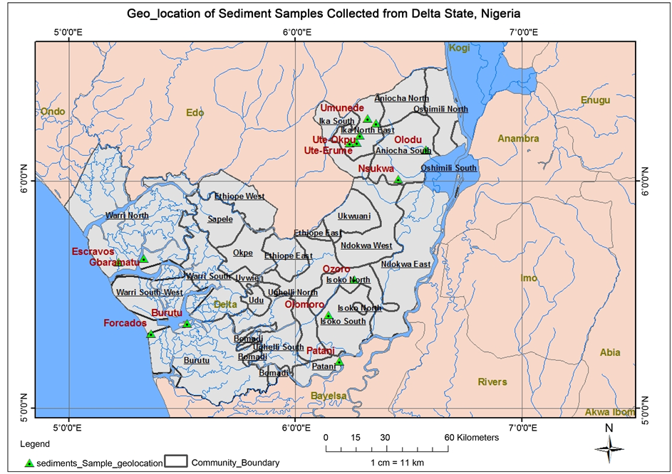 Eleven Oil Producing communities and two non-oil producing communities were identified within Delta state and selected for sampling. Figure 1 shows the map of sampling communities within the state. Sediment samples