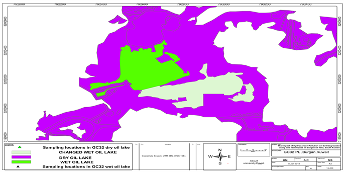 did not have petroleum odor clean soil represent layer 3. It is inferred that the Total petroleum hydrocarbon (TPH) for wet oil lake in the study area (zone 13), Sludge material has been found to contain mean TPH concentrations in excess of 19%. Underlying contaminated soil was found to contain a mean average 3.4% for TPH concentrations, the deeper layer had mean average TPH concentrations in the range of 0.06% and as for the dry oil lake inferred that the surface tar material was found to contain mean TPH concentrations of approximately 7.3%. Underlying contaminated soil was found to contain mean 2.5% TPH concentrations, the deeper layer had mean TPH concentrations in the range of 0.07%, the estimated contaminated area in GC32 PL dry oil lake about 557617.136 m2, and volume of contamination calculated on surfer with an assigned level for the base of the contaminant was about 168776.55 m3. As for GC32 wet oil lake zone 13, the estimated contaminated area about 145285.43 m2, (Area of contamination has increased in 2017 by 69,800 m2), and volume of contamination calculated on surfer with an assigned level for the base of the contaminant was 128947 m3 divided into 63,096 of oil sludge and 65,851 m3 of wet lake below oil sludge.