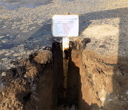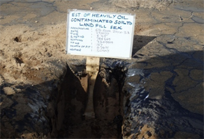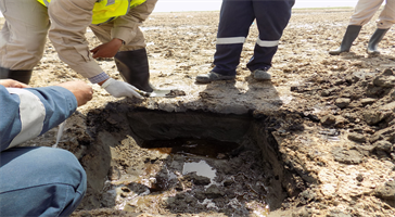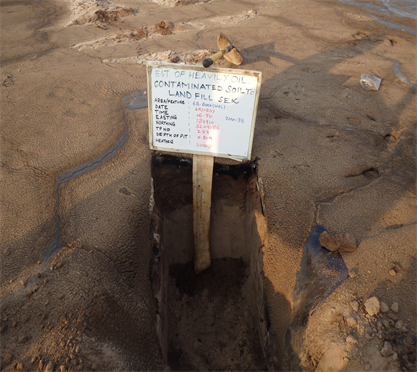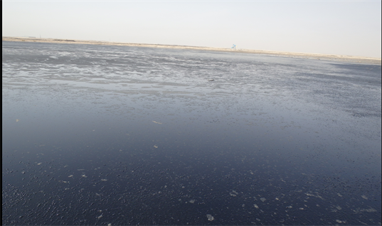 Massive pollution of marine and terrestrial environments resulted from the destruction of Kuwait’s oil production facilities at the conclusion of the Iraqi occupation. There are four types of oil contaminated soils (features) mainly: Dry oil lake contamination (DOL); Oil-contaminated piles (OCP); Wet oil lake contamination (WOL); and Wellhead Pits (WHP) two features types were identified within this study dry oil lake and wet oil lake. The short- and long-term consequences of this disaster to the terrestrial environment can be grouped into six categories: 1) soil compaction due to increased movement heavy military vehicles throughout the desert; 2) surface sediment disruption due to the placement of mines, construction of bunkers, foxholes and other physical infrastructure related to war activities; 3) degradation of vegetation and wildlife habitat; 4) soil contamination with petroleum hydrocarbons and heavy metals; 5) ground water pollution; and 6) impact on marine environment and coastal ecosystems. There was also significant negative impact on public health as well. The study was carried out on the Oil Lakes inside GC32 PL, Burgan oil field these lakes are classified into two major categories or features based on the texture and compositions of contaminant. First category is the wet oil lake, areas covered by black liquid or semi-solid oil material, over oil-contaminated soil, resulting from the surface flow of oil from damaged oil wells. It occurs in areas where liquid oil accumulated because of micro-relief and local topography. The consistency of wet oil lakes can change from solid during winter months to soft during hot summer months, creating temperature induced viscosity changes, refer to Figure 5 photos showing the texture of wet oil lake during site investigation. Such places include shallow depressions and drainage channels, the liquid oil surfaces may have a thin, hardened layer on the surface although it is not strong enough to support the weight of a person. Sludge material has been found to contain mean TPH concentrations in excess of 19%, underlying contaminated soil was found to contain a mean average 3.4% for TPH concentrations, the deeper layer had mean average TPH concentrations in the range of 0.06%. Figure 8 shows general view for the wet oil lake during site investigation.