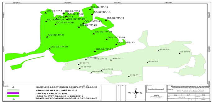 The spatio-temporal variation in the thermodynamic properties of surface material has been mapped in order to identify initially hydrocarbon polluted surfaces boundaries using satellite imagery data (2002 & 2016) earth’s surface material to make comparison between previous oil contamination boundaries and present day boundaries after the field verification through groundtruthing, and soil sampling. The field work procedures consist of two major activities first process is the groundtruthing (GIS) (Initial study of satellite images (2002 & 2016) and second process is the site investigation including soil profiling and sampling. The purpose of the groundtruthing study was to present the reviewed results of historical and recent satellite images and results of pre-condition survey for the study area (GC32 PL) inside Kuwait Oil Company fence(KOC), a part of 3B subarea (KOC sub divisions for the contaminated areas inside Burgan Oil field), also it includes the assessment of present contamination and under/above ground utility services that were identified during site survey, the findings of groundtruthing was used for delineating the present boundary of the contamination based on which the present area of soil contamination is estimated. Site soil characterization process was carried out through locating sampling points and collects soil samples for TPH laboratory analysis, profile the vertical contamination and to modeling the extent of the soil contaminated layers. All These data together defined the volumes and quantities of heavily contaminated soils, total petroleum hydrocarbon, and the oil contamination extension within the area of study. All data was entered into a database for analysis and map information was manipulated by a geographical information system, the map shows polygons and each polygon identifies the class of contamination within it essentially, the map unit boundaries indicated where it is expected that there will be a marked change in the type of oil contamination whether it is dry oil lake or wet oil lake, its level of concentration and depth of contamination, and this indicated that the map units correctly cover all the classified contaminated features within study area. The area for each individual polygon was calculated using GIS and then those in the same map unit category were summed together. The contaminated soil volume was calculated from the area measurements with multiplication by the mean contamination layer thickness that occurred for that map unit category and with the assistance of surfer software. So the Application of GIS and surfer software was essential to calculate the volume of contamination in this study.