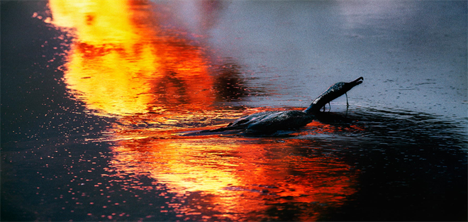 Figure 3. Fires in well head inside Burgan oil field, a picture of a dead bird in one of the oil lakes [5] .