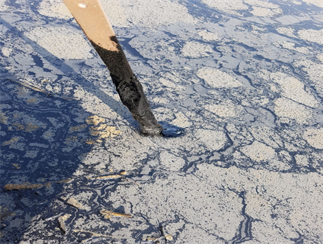 Figure 5. (a) Investigation of the crude depth within wood stick study area; (b) Crude and oil sludge layer covering top of the lake within study area.