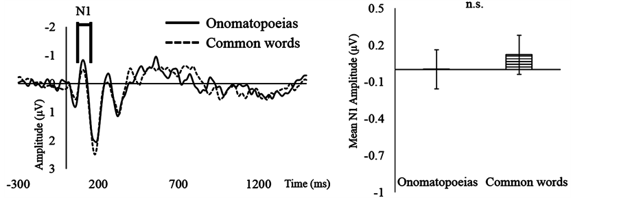 Figure 1. Grand mean event-related potential (ERP) waveforms over the fronto-central region (left) and the mean N1 amplitudes (right). No significant difference was found between onomatopoeias and common words in the mean N1.