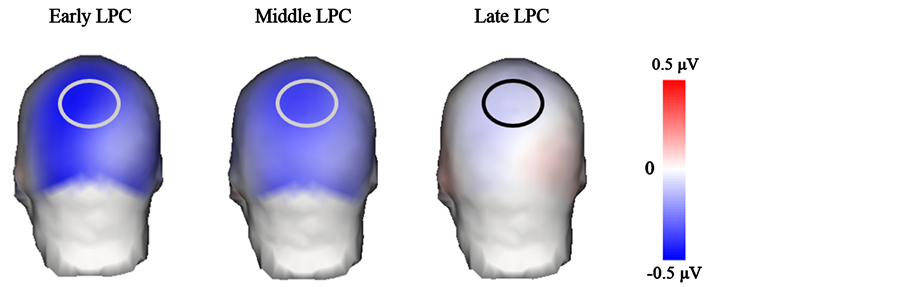 Figure 3. LPC topographic map (onomatopoeias―common words). The occipital posterior region is enclosed within a circle. Topographic maps of the early and middle LPC time windows show that onomatopoeias elicited smaller LPCs than common words over the occipital posterior region. LPC: late positive complex.