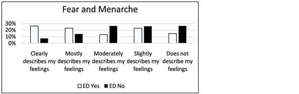 When asked to rate the feelings toward menarche using a 5-quality Likert Scale, ranging from “Clearly Describes My Feelings” to “Does Not Describe My Feelings,” there was a significant difference in the expression of fear toward the first period between the ED Yes and ED No group. The ED Yes members showed a significant amount of fear toward the event (p = 0.009), illustrated in Figure 1. Additionally, the ED Yes group significantly reported feelings of sadness (p = 0.021) and disgust (p = 0.026) toward menarche, shown in Table 1.