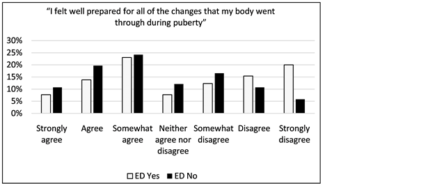 Figure 2. Preparedness for the body changes of puberty: Comparative preparedness for body changes during puberty between the ED Yes and No group showed significant differences (p = 0.015). Those diagnosed with an ED felt less prepared for the changes that their body went through during puberty.