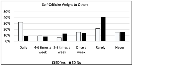 take place during puberty. ED Yes respondents significantly reported that they did not feel prepared for these body changes (p = 0.015). These responses are highlighted in Figure 2. Additionally, the survey asked participants whether they focused on weight during menarche; the ED Yes participants reported significant increased focus on their weight (p < 0.001) compared to the ED No group. Additionally, when asked, “Prior to receiving your first period, do you remember thinking about your weight?” ED Yes respondents reported more focus (p = 0.019) even prior to puberty, compared with ED No. The survey also inquired events such as body checking, which is a common technique used among ED patients. When asked, “Did you ever body check around the time of your first period (i.e.: look at yourself undressed in the mirror, lift up shirt, etc.),” there was no significant difference in frequency between the two groups. The final component of the survey inquired about self-criticism and asked, “Were you self-critical of your body around the time of your first period?” Both ED Yes and ED No respondents reported feelings of criticism. However, this question was followed up by asking, “Would you ever self-criticize your body to others,” to which the ED Yes respondents overwhelmingly reported that they would self-criticize their bodies to others much more frequently than ED No participants (p < 0.001), highlighted in Figure 3 and Table 2.