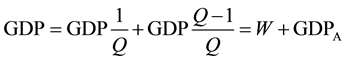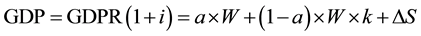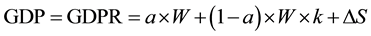 where GDPA denotes a part of GDP belonging to assets. Thus, formula divides GDP into two parts. The first (W) belongs to employees, and the second is assigned to assets. This sheds some light on GDP as the sum of all employees’ earnings plus the part belonging to assets (depreciation + interest + rents + appropriate part of companies income) and it correlates to the cost method of measuring GDP.