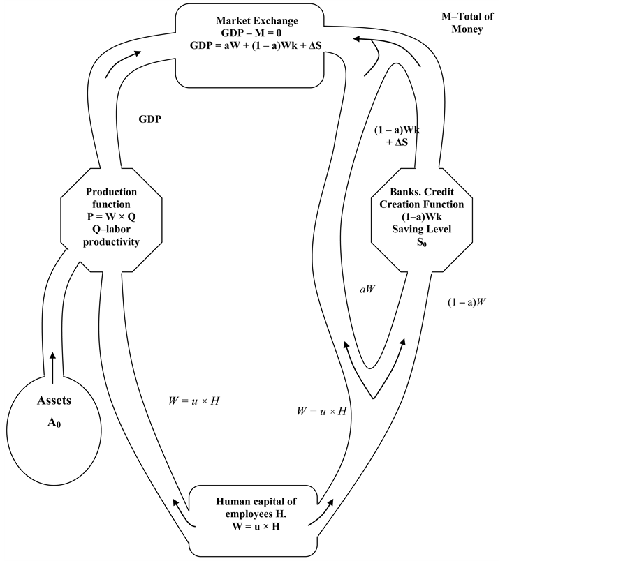forms value of final products generated by composition of the current labor of employees measured by pays (W), and the past work embodied in different sorts of assets. The second is the stream of compensations (W), i.e. work receivables. The source of these two streams is the same human capital of employees, and their edge is the market exchange of money (work receivables) to products and vice verse. This exchange can be described in the form of the equation of exchange. The streams run constantly, but to capture the quantitative relations, we use variables in the annual scale, in particular of the GDP category.