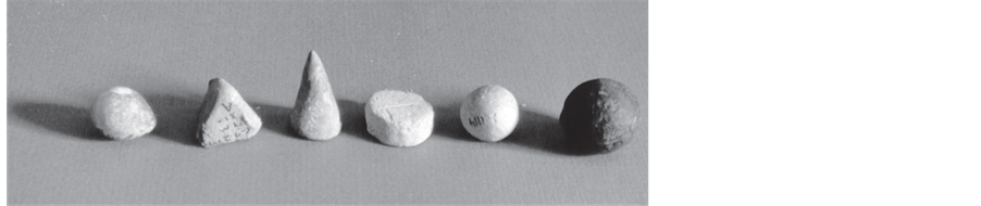 The theory and measurement of work in the physical sciences developed on the basis of heat engine research, along with the theory of thermodynamics; however, in the economy, work has been a subject of measurement from early millennia. The problem of the organization and measurement of human work in teams emerged naturally from the beginning of civilization. As M. Sliwa and M. Dobija explain, [4] “…it starts at the point when human beings first encountered the problem of how to work collectively, be able to achieve advantages thanks to the specialization and co-operation, and how to divide the effects of the work proportionally to the contribution of individuals.” Archeologists D. Schmandt-Besserat ( [5] : 51-93) has shed much light on the origin of writing and counting as well labor accounting. She noticed a large number of small clay artifacts of various shapes which she refers to as “tokens”. Plain tokens appear from ca. 8000 B.C. onwards. Figure 1 presents various tokens from Mesopotamia (Iraq), ca. 4000 B.C. The cone, spheres and disk represented various measures of grain; the tetrahedron stood for a unit of labor.