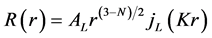 whose solution is the spherical Bessel function of order L, (the second solution has been dropped out since it diverges at the origin) and thus, the radial wave function is