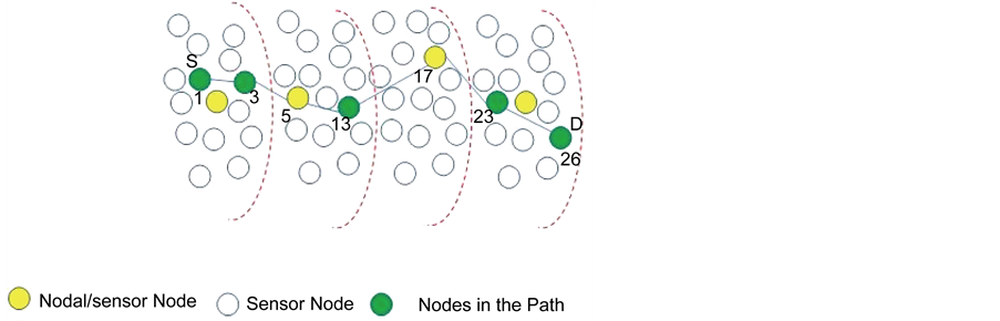 The path considered for data transmission is {1, 3, 5, 13, 17, 23, 26} where 1 and 26 are the source and destination nodes available in the open-path depicted in Figure 1. Nodes 5 and 17 are the nodal nodes, where node 5 controls and monitors set of nodes {1, 3, and 13} whereas node 17 controls and monitor set of nodes {13, 23, and 26}. These nodal nodes keep track of information of all nodes associated with it. The information includes location, energy level and node identity. If any node trying to misbehave or compromise during data transmission by false identity these nodal nodes identify it and send the information to the base station about the malicious node. The base station will take further action by eliminating the malicious node while establishing networks in the next round.