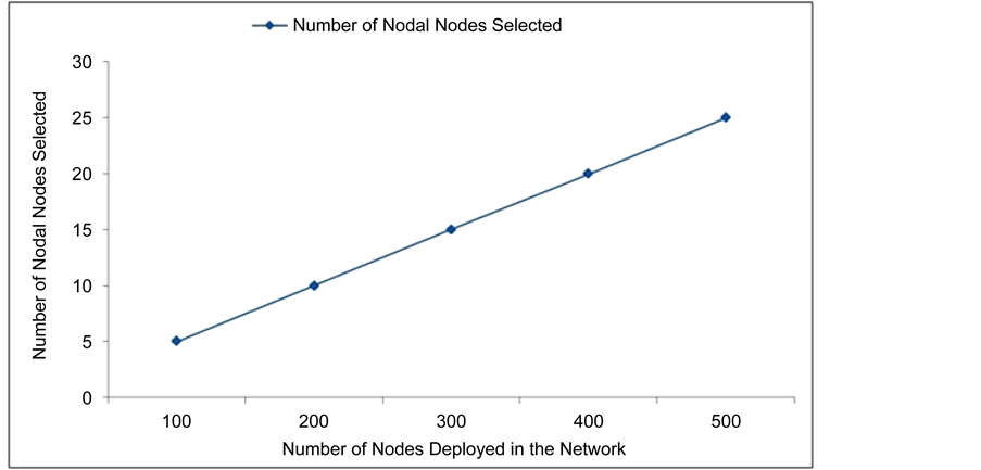 Figure 3 shows the phenomenon that is to identify the nodal node in each layer gives the complete bridge between the layers and to identify the path. Entire nodes participating in the path are controlled and monitored by nodal nodes. These are the sensor node, which keep the replica of the data packet, and monitors the set of nodes associated with it. Number of nodal nodes in the path depend upon the number of sensor nodes becomes active in the route. If number of nodes increases or path length holds the highest number of sensor nodes, nodal node selection also increases. Say network has 100 nodes in the initial round; let us assume 4 layers are capable of holding the sensor node information. So that’s 4 to 5 nodal nodes were created in a dynamic fashion to keep track an eye of all sensor nodes in the respective layer. In case of path generation this nodal layer which is identified is become active to enhance the data transmission. In increasing case of nodes in the network layer is reformed and nodal node selection is reframed based on high energy and centric to the layer. Numbers of nodal nodes deployed in the network are shown.