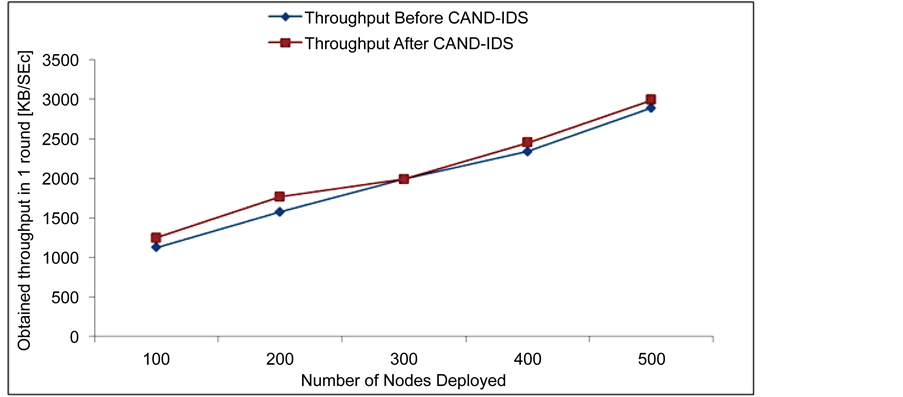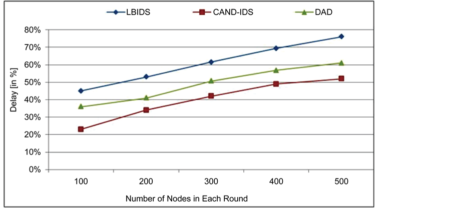 delay taken by the LBIDS and CAND-IDS methods in terms of number of nodes. From Figure 8, it’s clear that the delay taken by the proposed CAND-IDS is less than the existing approaches LBIDS and DAD. Similarly, CAND-IDS obtained higher throughput than the LBIDS and DAD. In terms of energy CAND-IDS consumes less energy than the LBIDS and DAD in all the rounds of operation and it’s shown in Figure 10 clearly.