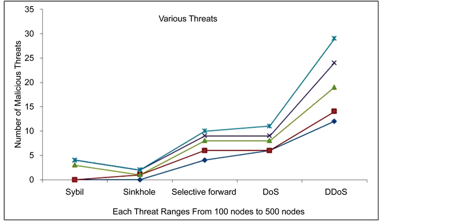 In Figure 7, for simulation strategy, all kinds of threats were exercised; each threat is executed for 100 to 500 nodes of step count 100. Considering the Sybil attack, for 100 to 200 nodes no Sybil were deducted, this is due to protocol restriction during node deployment, for the 300 node algorithm is tracked 3 nodes as malicious and for 400 to 500 nodes in the network, there is a possibility of 4 Sybil nodes as an outcome. Nodal nodes will identify this Sybil when false identity is accessed, any of the nodes by this algorithm and immediate action will be taken place. Sinkhole attack is exercised for 100 to 500 nodes for a step count of 100. The algorithm allows identifying 1 attack for 200 nodes, which is passive and not transmitted data packet to the appropriate node. When node number is exercised for 2400 to 500, number of sink hole triggered is 2 to 3. Hence the algorithm satisfactorily found the sink hole in all norms. Similarly for DoS attack nodes, the algorithm will be working in fine mode, to identify the intruder in large means; mostly all near to the number of DoS attacks were identified.