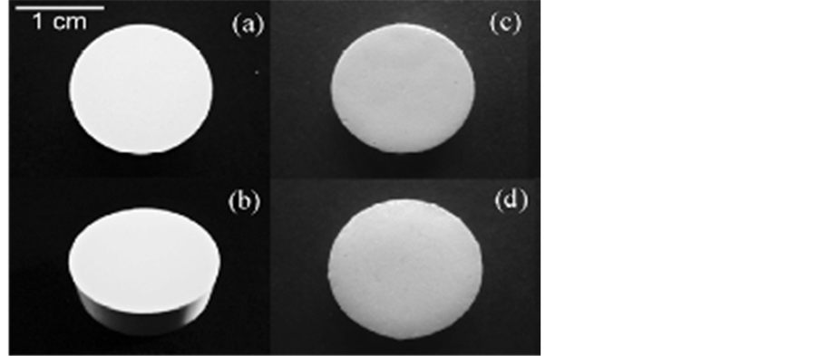 Figure 1. The physical feature of the Si3N4 discs sintered at 1650˚C for 2 h in top-view (a) and side-view (b), The Si3N4 ceramic coated with borosilicate glass through firing at 1100˚C (c), and The Si3N4 ceramic coated with 5 wt% ZrO2-added borosilicate glass through firing at 1100˚C (d).