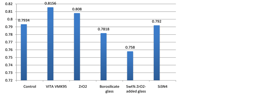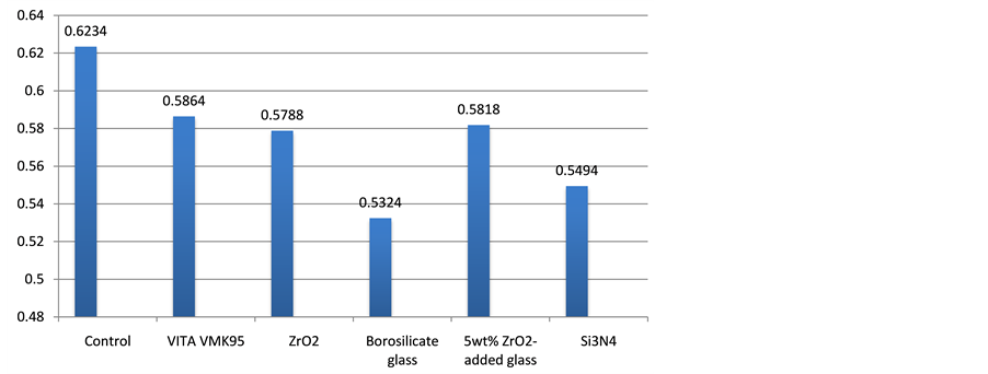 The Vicker’smicrohardness results of Si3N4 ceramic coated with veneering materials are shown in Table 1. The Vickers hardness values of borosilicate glass and 5 wt% ZrO2-added borosilicate glass are similar to that of VMK which is the commonly used commercial veneering material. All these values are within the range of the hardness of human enamel (3 - 5 GPa) [10] .