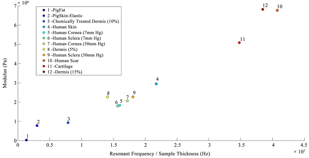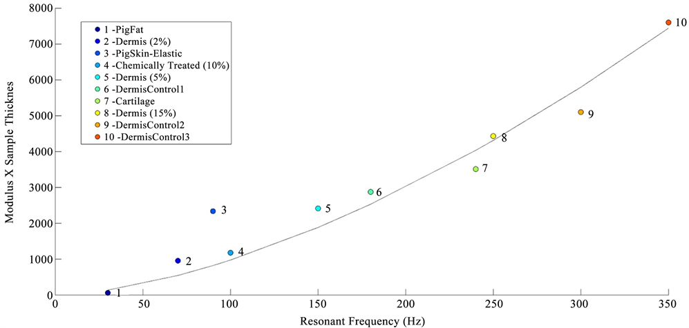 Figure 2. Calibration curve showing the relationship between the product of the modulus (E) times the tissue thickness versus resonant frequency measured using vibrational OCT for diffferent tissues. The calibration curve includes points from pig fat and elastic tissue, human decellularized dermis at different strains, chemically modified decellularized dermis, and bovine femoral cartilage.