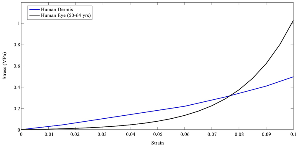 Stress-strain curves for inflated eyes obtained from the literature [18] were compared to those of decellularized human dermis previously published [16] [17] as shown in Figure 3. The stress-strain curves for decellularized human dermis are similar in shape to the curves for porcine and human eyes consistent with other tissues containing fibrous collagen networks [15]. These curves show increased slopes with increasing strains. The tensile stress-strain curves of decellularized human dermis and inflated eyes are composed of low and high modulus regions consistent with previous reports on mechanical measurements on human dermis and skin [15] [16] [17]. The difference in the length of the low modulus region is related to the strain required to recruit the collagen fibrils and fibers along the tensile direction [15]. The similarity in the shape of the stress-strain curves between human and porcine eyes and decellularized dermis indicate that the stress-strain behavior has a similar mechanism in these tissues, e.g., at low strains the collagen fibrils and fibers are only partially recruited in the loading direction and become fully recruited at high strains increasing the value of the modulus.
