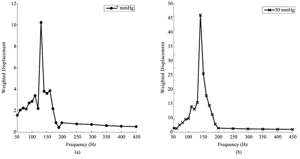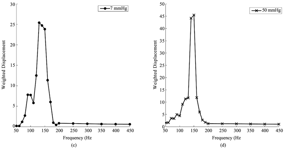 Figure 4. Weighted displacement versus frequency for human cornea (a) (b) and sclera (c), (d) at low (7 mm Hg) and high (50 mm Hg) pressures. The resonant frequency is determined as the frequency at which the maximum displacement occurs. Note peaks from the Styrofoam blocks and line noise were removed. The resonant frequency changes are small with increased pressure. The increased moduli at higher pressures are listed in Table 1.
