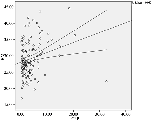 Recent studies with similar population found associations between CRP and BMI. Eight European countries, in 2013, showed correlation between the above markers. Even stratified by sex, which differs from the present study, the values for p were statistically significant (male: p = 0.000062; female: p = 0.001) [23] . In another study conducted in the same year, in the city of Rio de Janeiro (Brazil), was evidenced similar association between the same markers, with values of r = 0.51 and p < 0.0001 [24] .