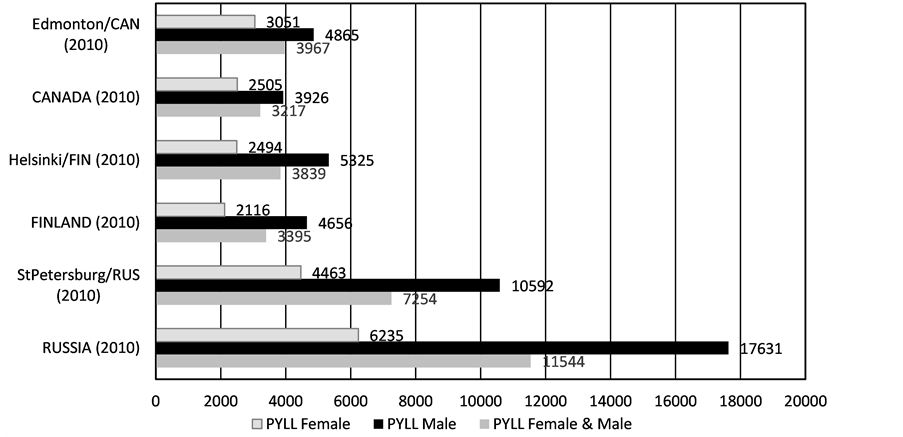In 2010, the age standardized PYLL-rates for populations of Helsinki, Edmonton, and Saint Petersburg were correspondingly; 3839, 3967 and 7254 (Table 2). Health of population in Helsinki is only slightly better than that of Edmonton. However, PYLL-rate for the population of Saint Petersburg is about twice as high as in the other cities.
