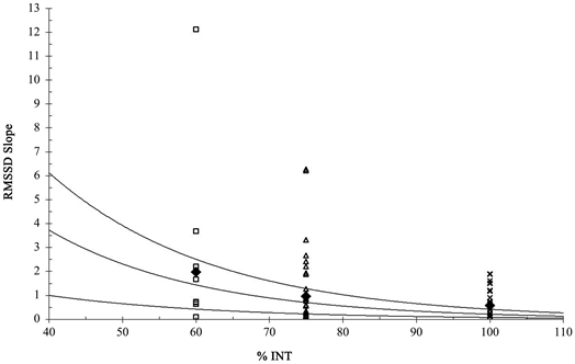 The authors also found that its reactivation following exercise behaves in a linear way, at least for the first 30 minutes, and the slope can be calculated at any point during those 30 minutes. In that study [20] this recovery slope (RMSSD-Slope) had a good inverse correlation with exercise intensity but it is different for each subject at the same effort intensity, making it a good indicator of ITL.