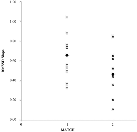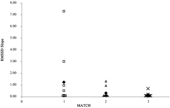 Figure 2. Distribution of RMSSD-Slope values over three badminton matches. Abbreviations: RMSSD (Root Mean Square of the Successive Differences between adjacent RR intervals in ms).